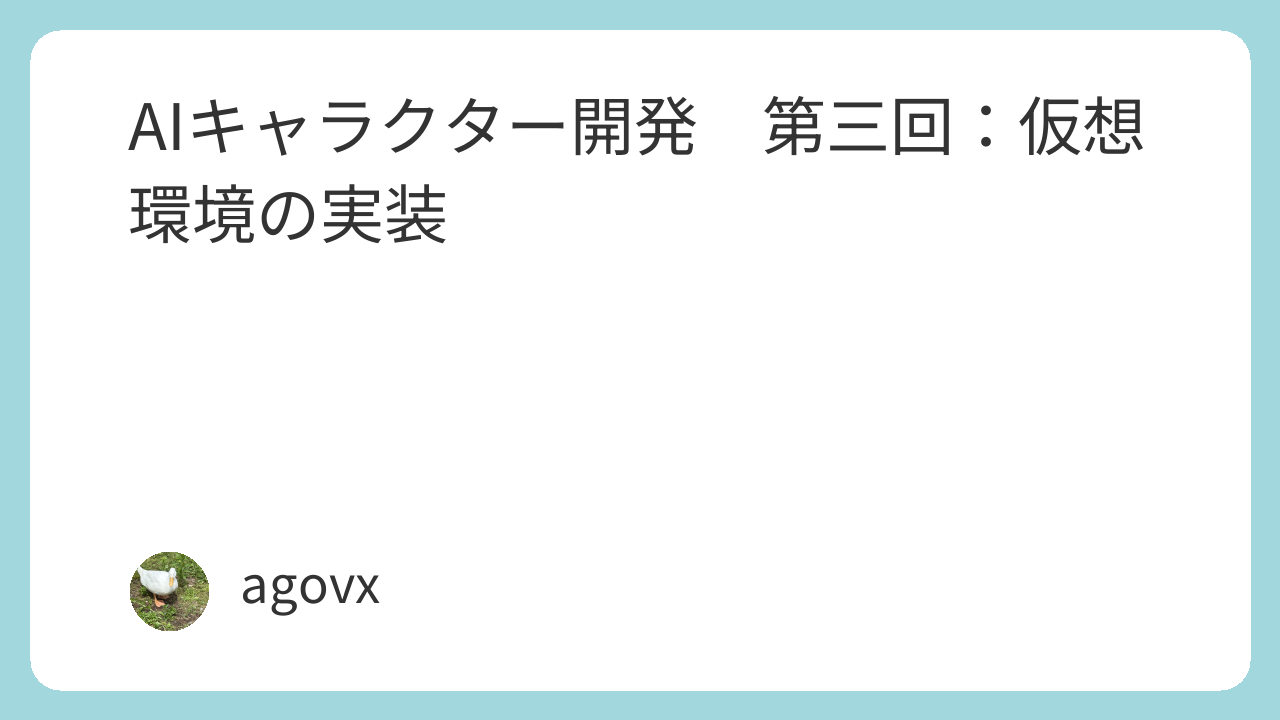 前回示したように仮想環境の開発を行なった。結論としては仮想環境の構築はしない方向を考える。ただ良い点と悪い点を見つけられたため記載する。